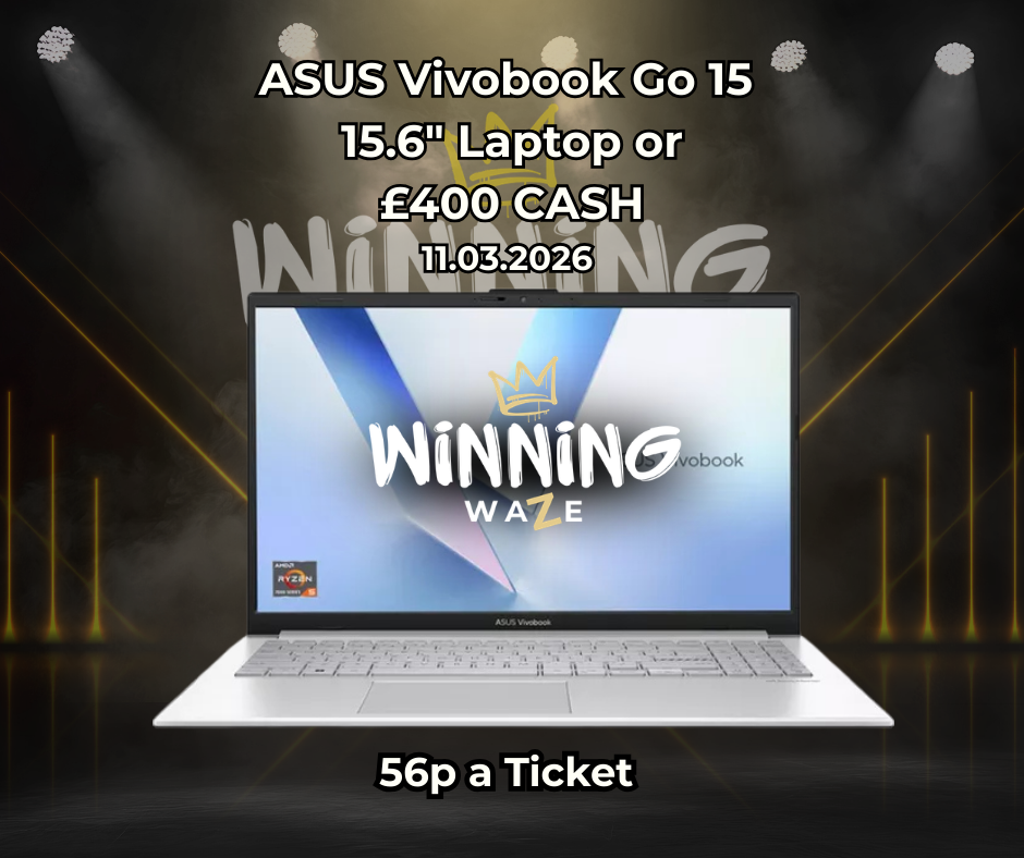 Get ready – we’ll be spinning the WaZe Wheel very soon! One lucky WINNER will be the proud new owner of the amazing ASUS Vivobook Go 15 – 15.6″ Laptop or £400 CASH. Be quick, there is only 2,500 available tickets!!.